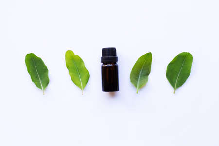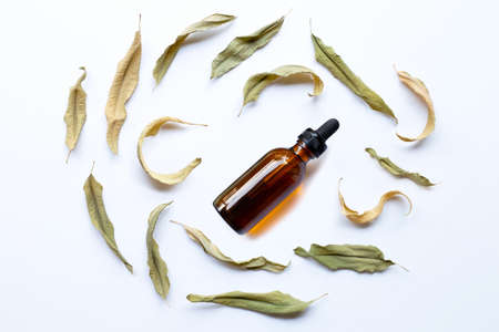 Eucalyptus oil bottle with dry leaves on white background.