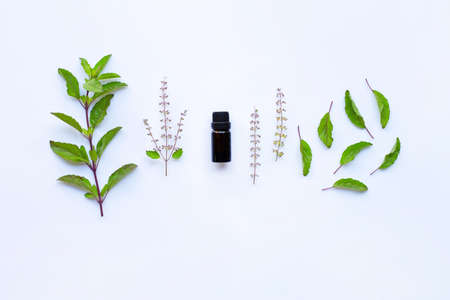 Holy basil essential oil with fresh leaves on white background.