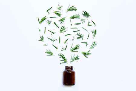Medical bottle glass with fresh rosemary leaves isolated on white background. Heart shape