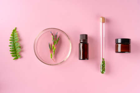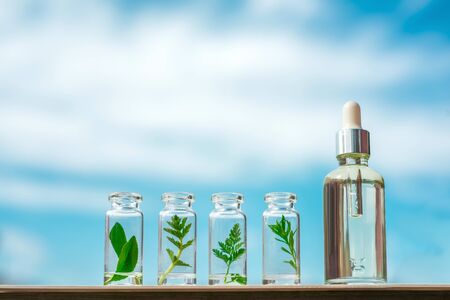 Homeopathic oil, serum and bottles with plants on a blue background. Concept of natural organic cosmetics for skin care