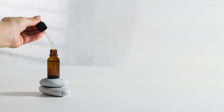 A womans hand holds a pipette and drips skin serum into a glass dropper. Care cosmetics. Copy space.