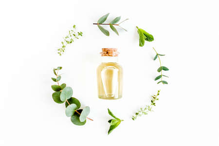 Essential oil and round wreath frame made of mix of herbs, green branches, leaves mint, eucalyptus, thyme and plants collection on white background.