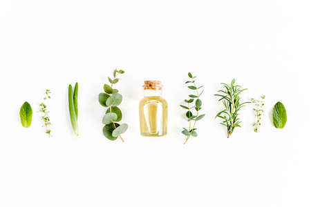 Essential oil and mix of herbs, green branches, leaves eucalyptus, aloe Vera, rosemary, thyme on white background. Flat lay. Top view.