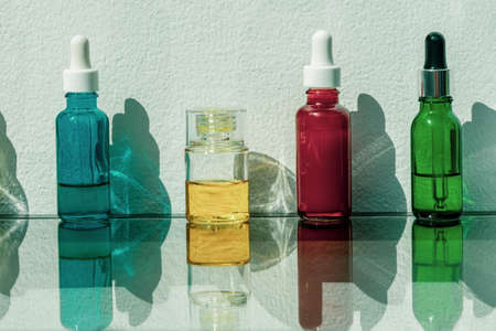 Colored glass bottles with cosmetic liquid on a table with sun shadows. Frontal view