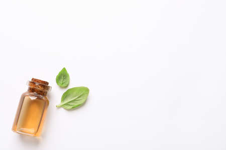 Bottle of essential basil oil and fresh leaves on white background, flat lay. Space for text
