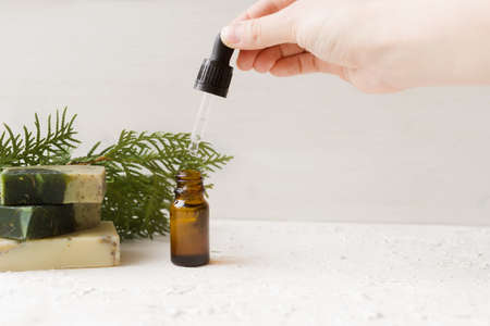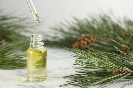 Dripping pine essential oil into bottle at white marble table. Space for text