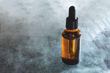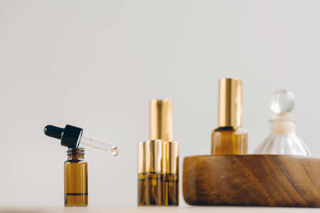 Amber bottle with serum or essential oil. Natural organic cosmetic, aromatherapy message oil.