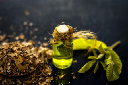 Close up of extracted beneficial oil of guava for weight loss, anti aging, and for god hair growth and for skin care with dried leaves of guava with fresh leaves in a bottle on wooden surface.