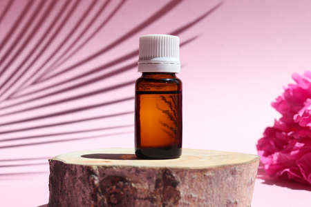 Bottle of essential oil on a wood cut with peony flowers and palm leaf shadow. Natural or alternative medicine. Aromatherapy, beauty concept. Selective focus