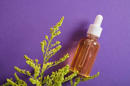 glass dopper bottle with orange serum mock up blank top view copy space purple background