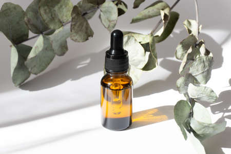 Open amber bottle without cap with eucalyptus branche. White background with daylight and beautiful shadows. Skincare serum or essential oil natural cosmetic. Beauty concept for face and body care