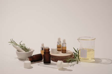Serum or essential oil bottle on light background. Natural organic cosmetic