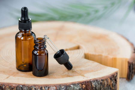 aromatherapy. On a wooden stand was a glass bottle with a pipette for oil, lotion, and a palm leaf. Natural organic eco-cosmetics. Layout of the beauty salon branding.