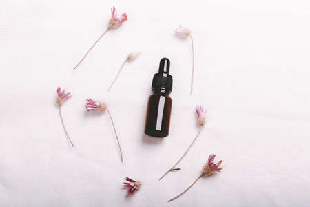 Essence serum. Dark pipette botle, cosmetics skin care. Dried plants pink flowers