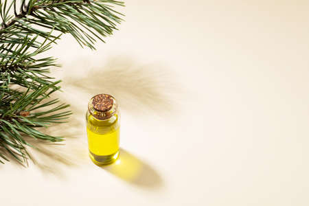 Small glass bottle of essential pine oil with pine branch and shadows on beige background. Aromatherapy and spa concept. Copy space for text.