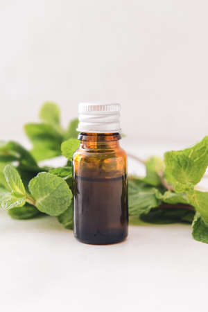 Bottle of mint essential oil on light background