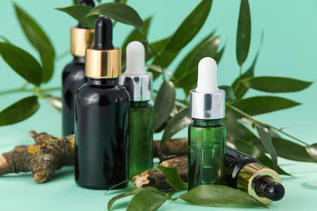Bottles of natural serum, tree branches and plant leaves on turquoise background