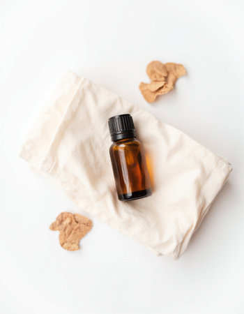 mockup glass bottle Essential oil or serum cosmetics with eucalyptus branches on textured white background with copy space top view. Brown glass cosmetic bottle. Wood decor driftwood.