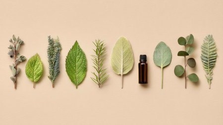 A beautiful flat lay arrangement of fresh green leaves next to an essential oil bottle on a soft beige background, perfect for wellness and beauty themes.