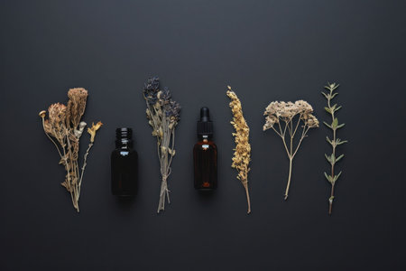 Assorted dried herbs and essential oil bottles arranged on a dark background