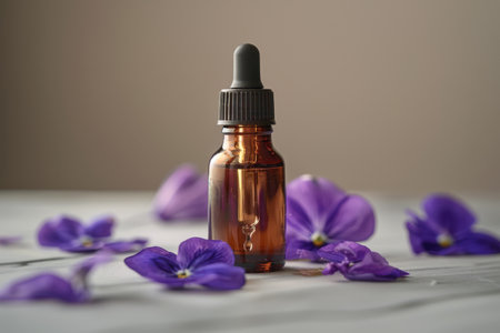 A dropper bottle of essential oil surrounded by delicate purple viola petals on a neutral background