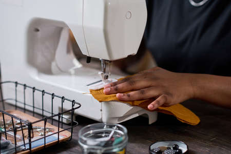 Hand of young black woman creating part of new fashionable piece of clothing while using electric sewing machine in workshop