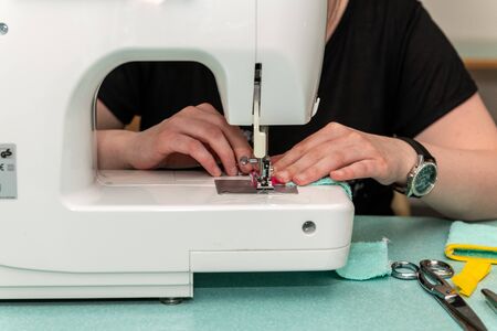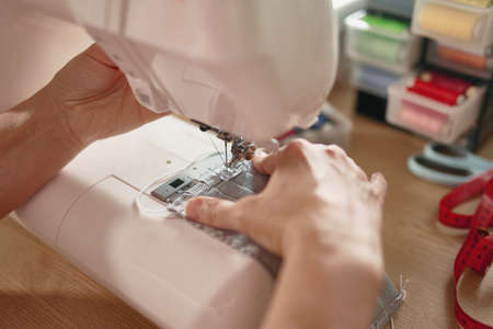 Close up view of hands of a lady working in her laboratory. Woman sews with sewing machine creates accessories repairs mend clothes embroider and packs trendy clothes. Works at home. Leisure time