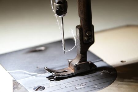Industrial flat-seam sewing machine. Close-up. Soft focus