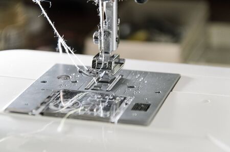 Sewing machine. Frontal view, the upper thread is tucked in to work close-up. Electric sewing machine with push-button control. Needlework, crafts at home.