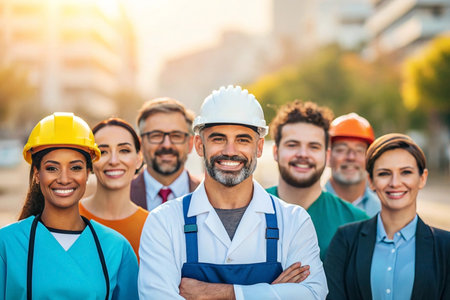 A diverse team of engineers and construction workers smiling together outdoors. Concept Outdoor Photoshoot, Teamwork, Diverse Group, Engineering, Construction Workers