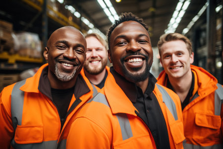 A diverse group of men stand side by side, posing for a group photo, group of smiling construction workers wearing uniforms, AI Generated