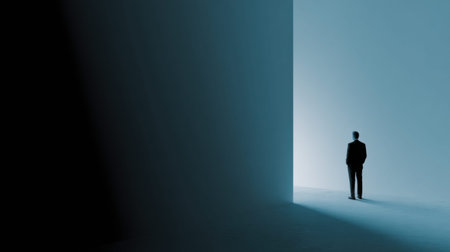 A silhouette stands in a quiet space with even lighting, representing the concept of making choices in modern business ethics.