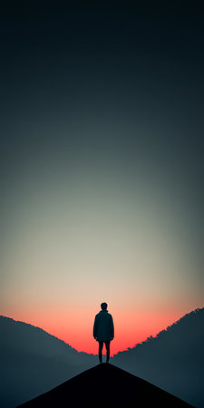 Silhouette of a man standing on a hilltop, evoking feelings of solitude and introspection in a minimalistic black and white setting