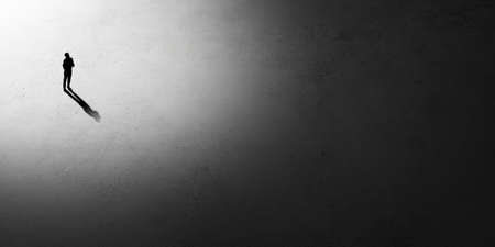 Silhouette of man walking in the night toward the light, view from above. Way of life, going nowhere. Flyer with copyspace. Mind and art concept, loneliness, freedom of choice. Abstract illustration.