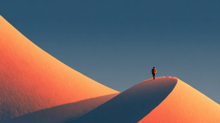 A breathtaking scene capturing a solitary figure standing atop a snow-covered dune at sunset, showcasing the beauty of nature and tranquility.