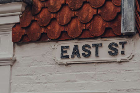Street name sign on a wall of a building in East Street, Rye, East Sussex, UK.