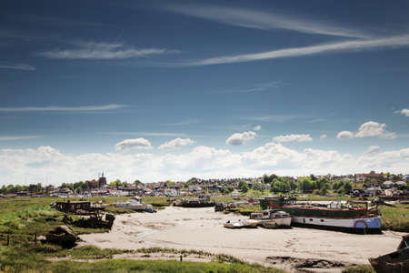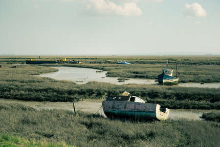 abandoned rusted boats on low tidal grounds in Essex, UK