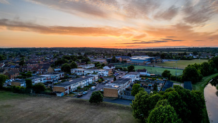 Aerial view of Hoddesdon, Hertfordshire showing river, sunset and housing estate