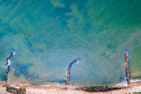 Aerial top view from drone to the seacoast and old concrete piers. Sea background.
