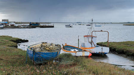 Colorful fishing boats on the river Alde at Aldeburgh, Suffolk, UK