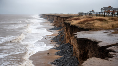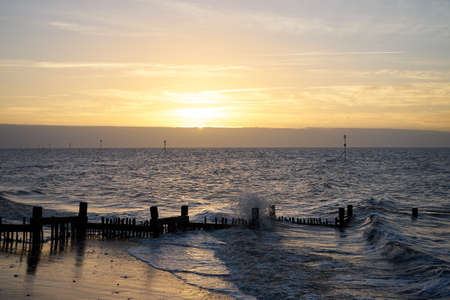 Dramatic shot of a wooden breakwater found at Hornsea Beach, East Yorkshire, UK.