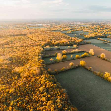 View from top on Essex with River Crouch and mosaic fields and meadows. Horizontal full frame crop with river in middle