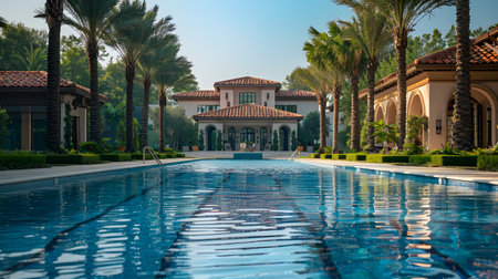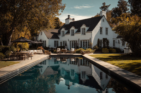 An impressive estate features a pristine pool reflecting the architectural details of the large white house. The scene is bathed in warm sunlight, emphasizing the symmetrical composition and manicured landscaping. This image could be used for real estate marketing, architectural presentations, or lifestyle content, evoking a sense of luxury and tranquility.