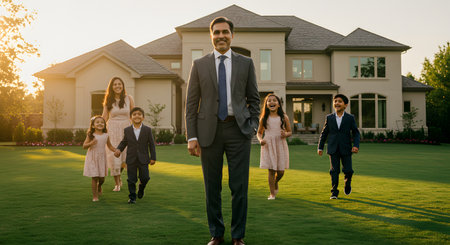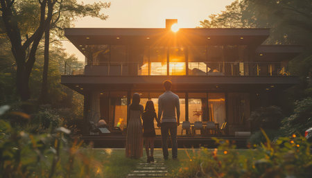 A couple and their child stand in front of a large house with a sun shining on it. Scene is warm and inviting, as the family appears to be enjoying the beautiful day and the view of their new home
