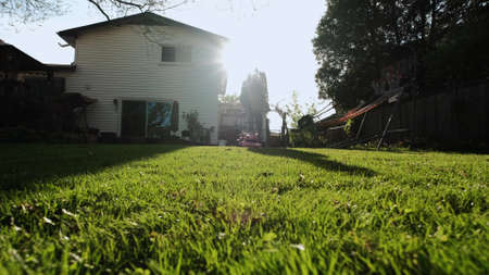 A man mows the grass in the backyard with an electric lawn mower. Slow motion