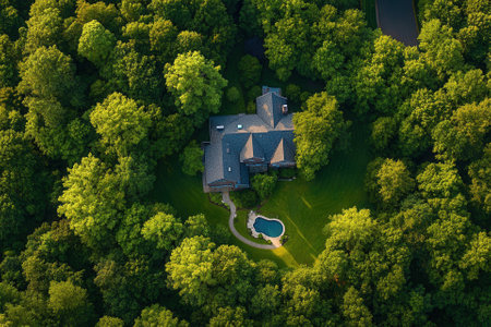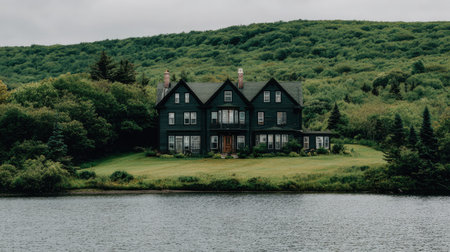 An impressive house stands on a grassy area near a lake. The dark building contrasts against vibrant green trees and a rolling hillside. The scene exhibits natural lighting. The image suggests potential use in real estate, architecture, or environmental themed content.