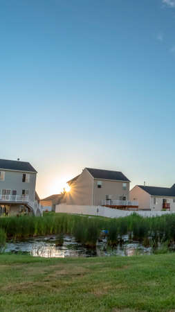 Vertical Sunset views in the suburb with pond and houses against bright sun and blue sky. Exterior view of homes with outdoor stairs leading to balconies at the facade.
