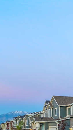 Vertical Exterior of homes with gable and valley roofs against mountain and sky at sunset. The houses also has front porches and gray walls.