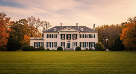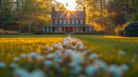 Colonial American Home Glowing in Sunset Light: Professional Photo with Copy Space. Concept Landscape Photography, Golden Hour Light, Historical Architecture, Copy Space, Professional Image