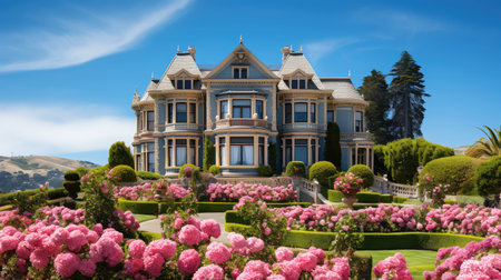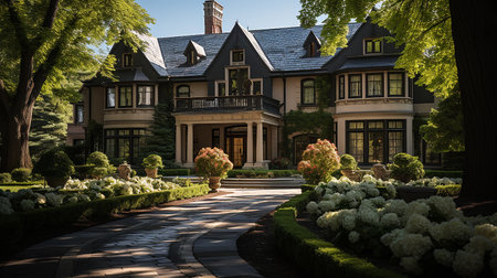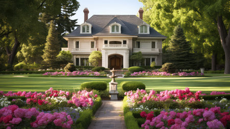 Charming house surrounded by colorful flowers in a beautiful garden during late afternoon light